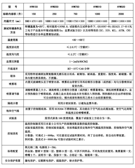 MC028系列鹽霧試驗箱 一、產(chǎn)品簡介 本鹽霧腐蝕試驗設(shè)備利用含鹽溶液或酸性含鹽溶液,在一定的溫度和相對的濕度的環(huán)境下對材料或產(chǎn)品進(jìn)行加速腐蝕,重現(xiàn)材料或產(chǎn)品在一定時間范圍內(nèi)所遭受的破壞程度。設(shè)備可以用來考核材料及其防護(hù)層的抗鹽霧腐蝕的能力,以及相似防護(hù)層的工藝質(zhì)量比較,也可以用來考核某些產(chǎn)品抗鹽霧腐蝕的能力。它和環(huán)境試驗設(shè)備中的干燥箱,高溫箱,低溫箱,沖擊箱,低氣壓試驗箱等屬于同一類環(huán)境試驗設(shè)備。 二、技術(shù)參數(shù):